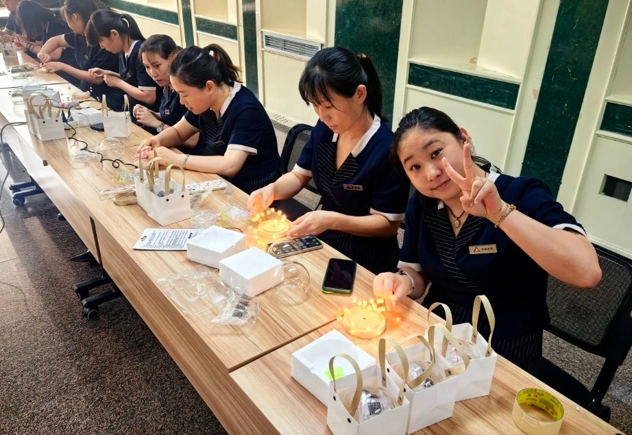 活動開始,工作人員詳細地講解了郁金香氛圍燈制作所需的材料、制作方法和技巧。員工們興致十足,學(xué)得十分認真,大家解開燈串、穿過底座、串起小燈、固定燈罩、打開電源,在燈光的照射下,每一朵郁金香都顯得栩栩如生。經(jīng)過一個多小時的努力,大家的小夜燈制作完成,紛紛拍照留念,記錄下這美好的時光。